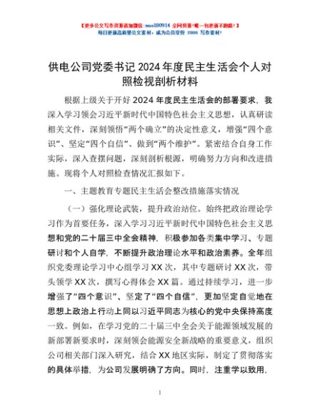 / 供电公司党委书记2024年度民主生活会个人对照检视剖析材料