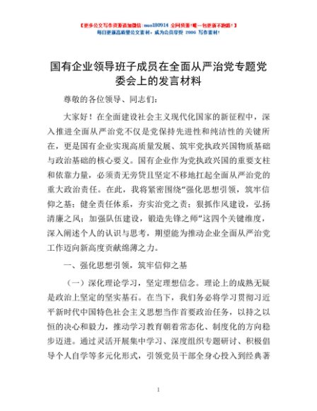 / 国有企业领导班子成员在全面从严治党专题党委会上的发言材料