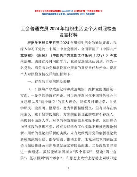 / 工会普通党员2024年组织生活会个人对照检查发言材料