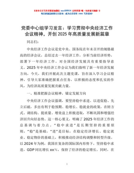 / 党委中心组学习发言:学习贯彻中央经济工作会议精神,开创2025年高质量发展新篇章