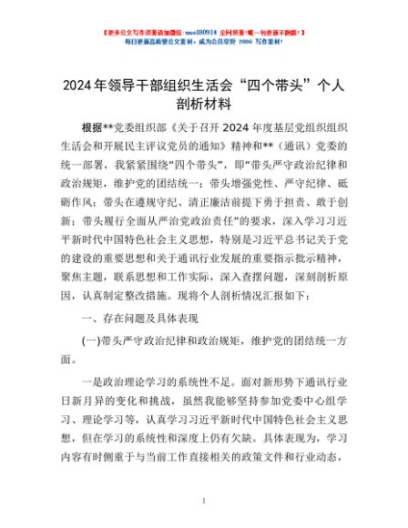 / 2024年领导干部组织生活会“四个带头”个人剖析材料