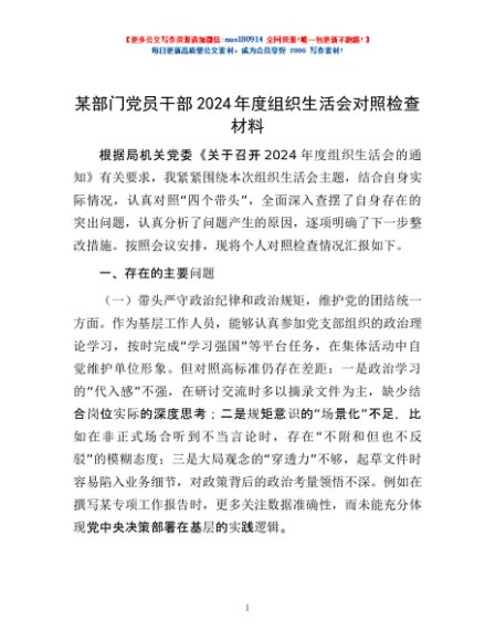 / 某部门党员干部2024年度组织生活会对照检查材料