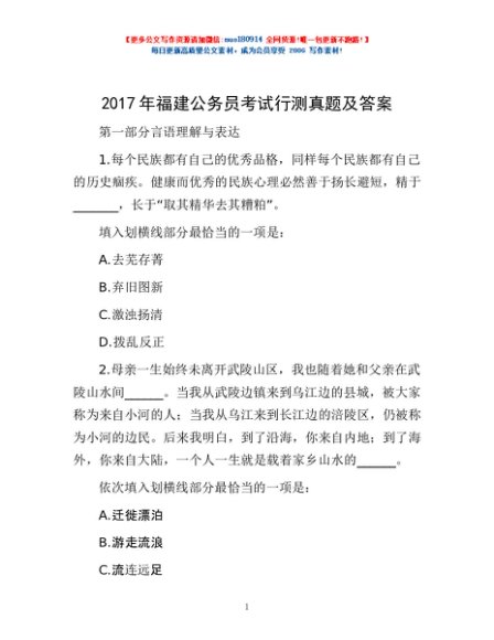 / 2017年福建公务员考试行测真题及答案