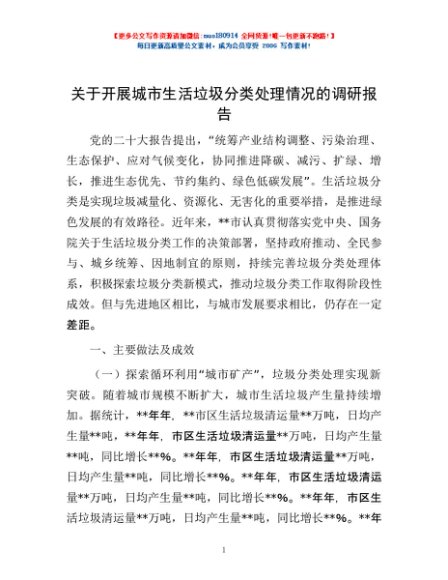 / 关于开展城市生活垃圾分类处理情况的调研报告