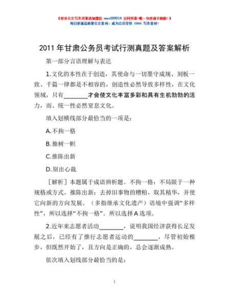 2011年甘肃公务员考试行测真题及答案解析