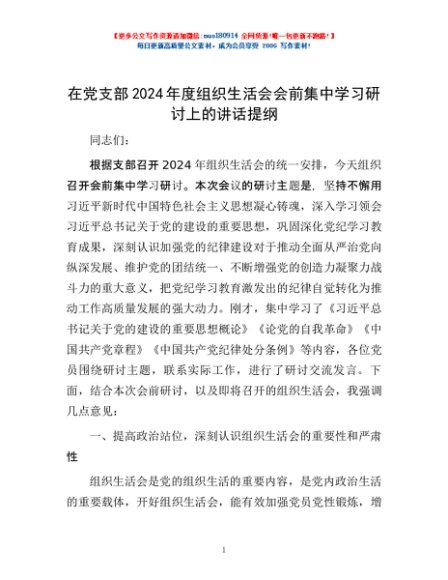 / 在党支部2024年度组织生活会会前集中学习研讨上的讲话提纲