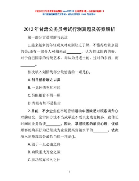 2012年甘肃公务员考试行测真题及答案解析