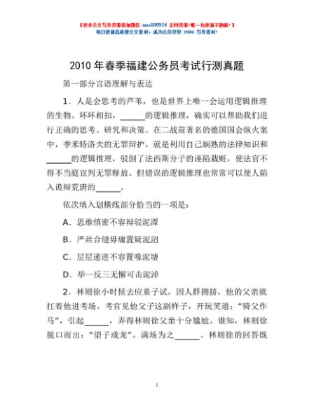 / 2010年春季福建公务员考试行测真题