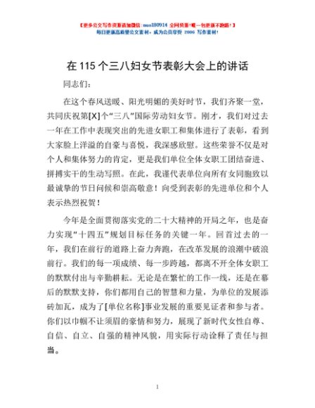 / 在115个三八妇女节表彰大会上的讲话