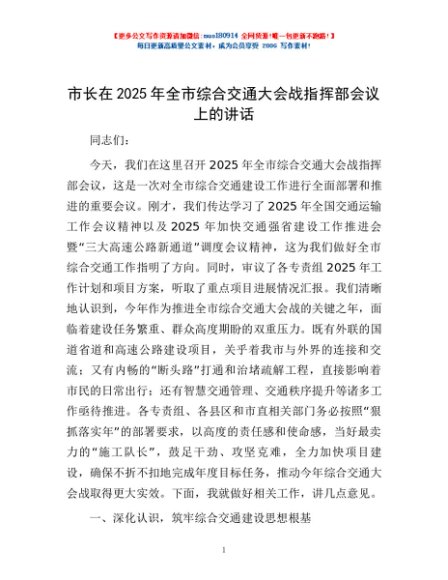 / 市长在2025年全市综合交通大会战指挥部会议上的讲话