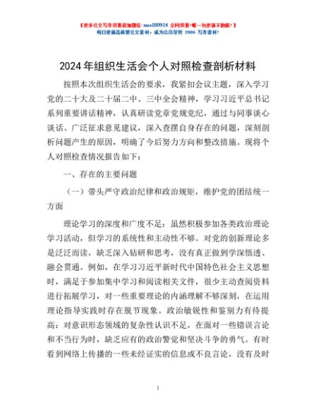 / 2024年组织生活会个人对照检查剖析材料