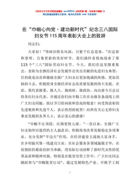 / 在“巾帼心向党 建功新时代”纪念三八国际妇女节115周年表彰大会上的致辞