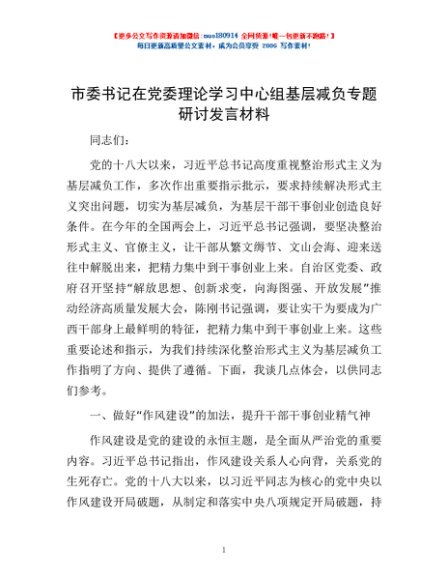 / 市委书记在党委理论学习中心组基层减负专题研讨发言材料