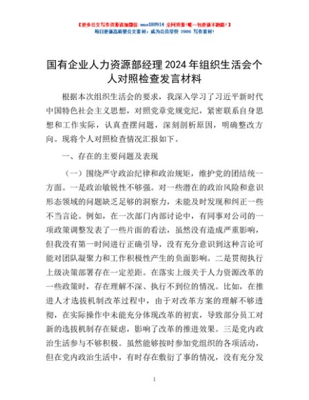 / 国有企业人力资源部经理2024年组织生活会个人对照检查发言材料