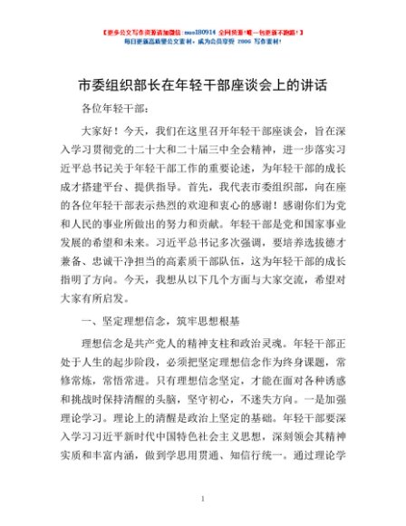 / 市委组织部长在年轻干部座谈会上的讲话