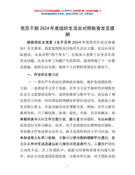 / 党员干部2024年度组织生活会对照检查发言提纲