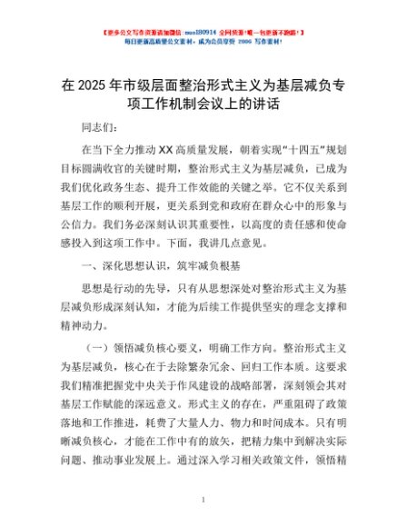 / 在2025年市级层面整治形式主义为基层减负专项工作机制会议上的讲话