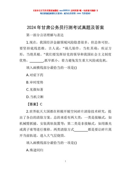/ 2024年甘肃公务员行测考试真题及答案