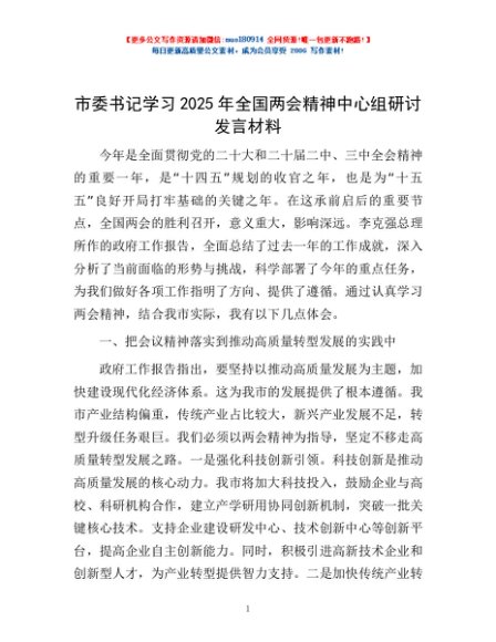 / 市委书记学习2025年全国两会精神中心组研讨发言材料