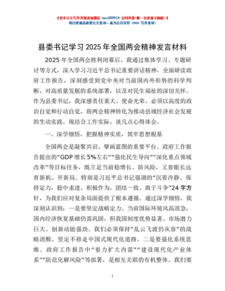 / 县委书记学习2025年全国两会精神发言材料