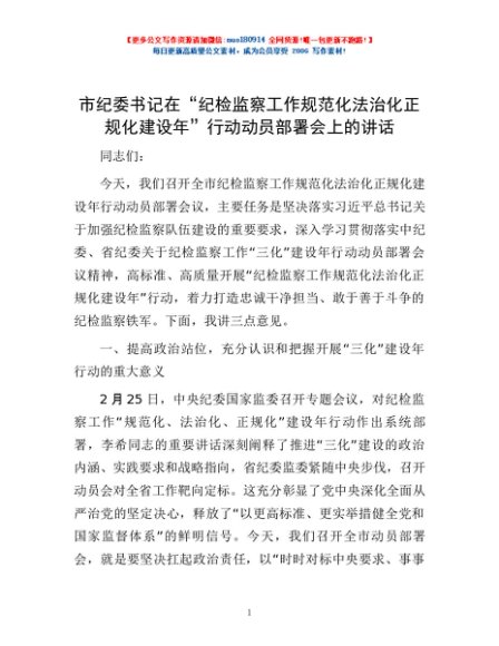 / 市纪委书记在“纪检监察工作规范化法治化正规化建设年”行动动员部署会上的讲话