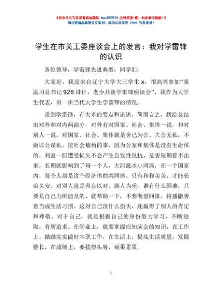 / 学生在市关工委座谈会上的发言:我对学雷锋的认识