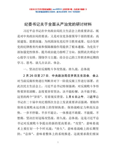 / 纪委书记关于全面从严治党的研讨材料