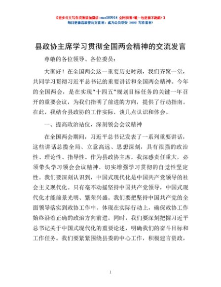 / 县政协主席学习贯彻全国两会精神的交流发言