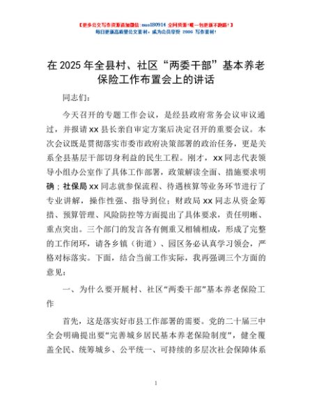 / 在2025年全县村、社区“两委干部”基本养老保险工作布置会上的讲话