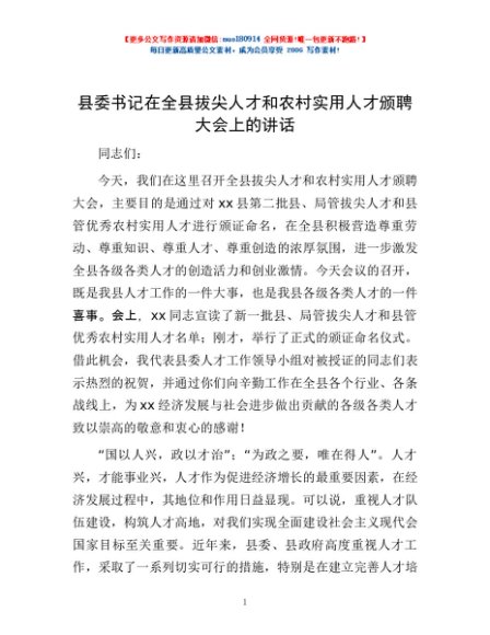 / 县委书记在全县拔尖人才和农村实用人才颁聘大会上的讲话