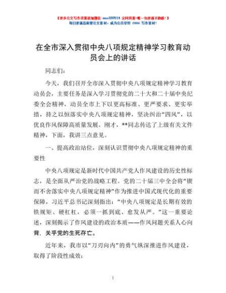 / 在全市深入贯彻中央八项规定精神学习教育动员会上的讲话