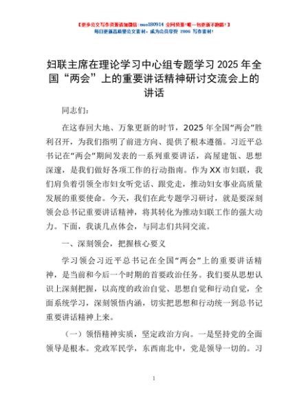 / 妇联主席在理论学习中心组专题学习2025年全国“两会”上的重要讲话精神研讨交流会上的讲话
