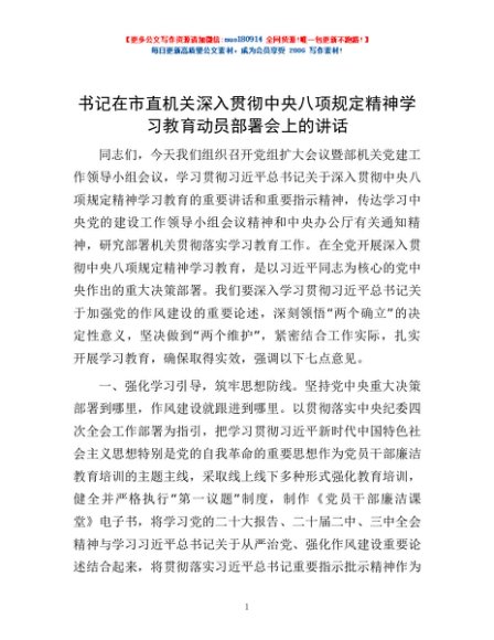 / 书记在市直机关深入贯彻中央八项规定精神学习教育动员部署会上的讲话