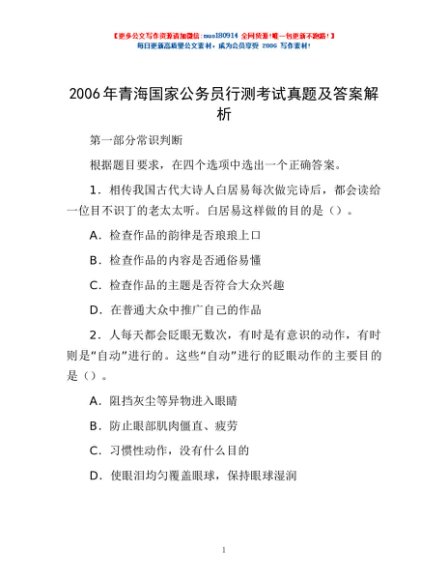 2006年青海国家公务员行测考试真题及答案解析