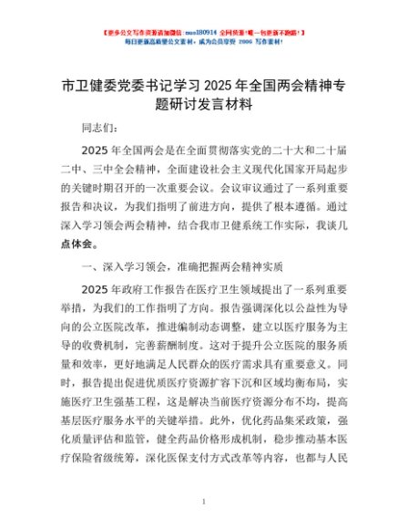 / 市卫健委党委书记学习2025年全国两会精神专题研讨发言材料