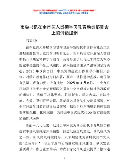 / 市委书记在全市深入贯彻学习教育动员部署会上的讲话提纲