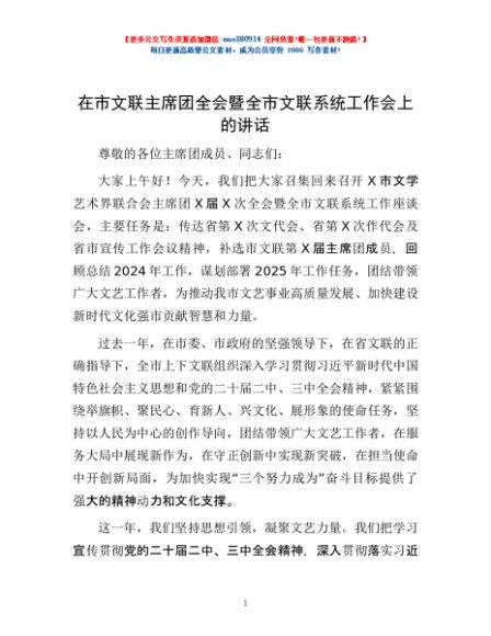 / 在市文联主席团全会暨全市文联系统工作会上的讲话