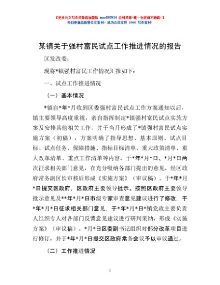 / 某镇关于强村富民试点工作推进情况的报告