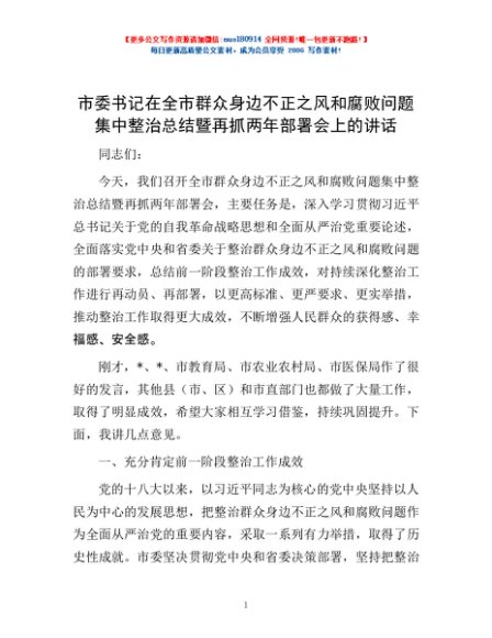 / 市委书记在全市群众身边不正之风和腐败问题集中整治总结暨再抓两年部署会上的讲话