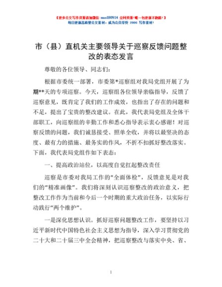 / 市(县)直机关主要领导关于巡察反馈问题整改的表态发言