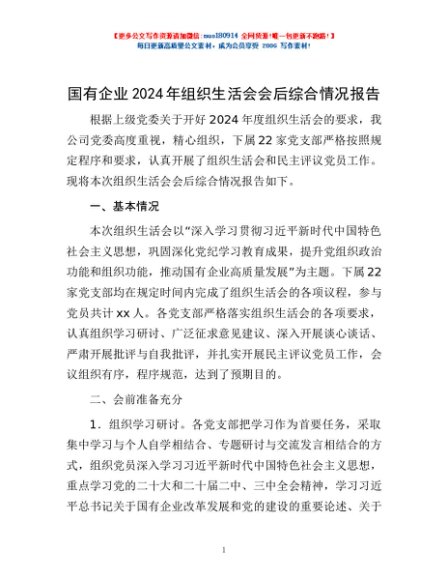 / 国有企业2024年组织生活会会后综合情况报告