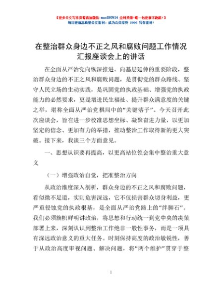 / 在整治群众身边不正之风和腐败问题工作情况汇报座谈会上的讲话