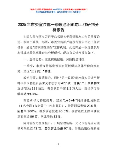 / 2025年市委宣传部一季度意识形态工作研判分析报告