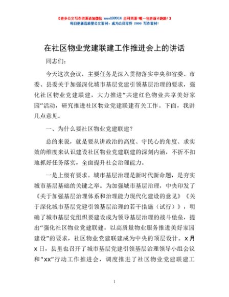 / 在社区物业党建联建工作推进会上的讲话