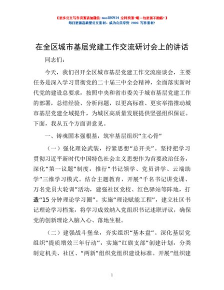 / 在全区城市基层党建工作交流研讨会上的讲话
