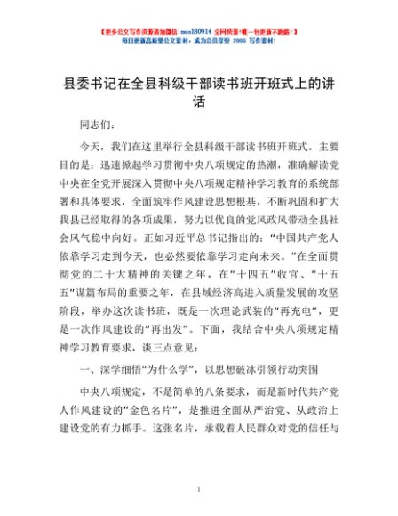 / 县委书记在全县科级干部读书班开班式上的讲话
