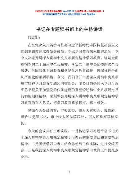 / 书记在专题读书班上的主持讲话