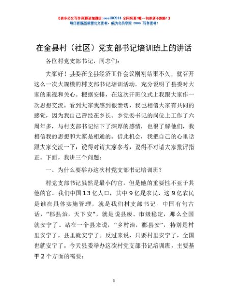 / 在全县村(社区)党支部书记培训班上的讲话