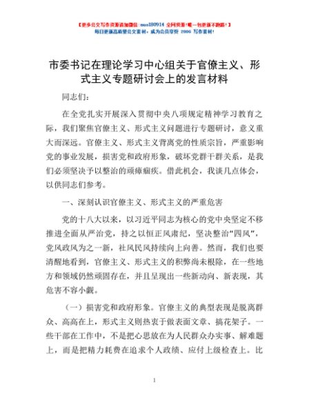 / 市委书记在理论学习中心组关于官僚主义、形式主义专题研讨会上的发言材料