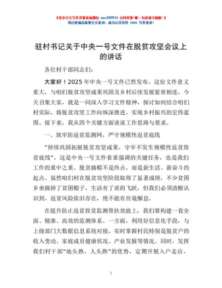 / 驻村书记关于中央一号文件在脱贫攻坚会议上的讲话